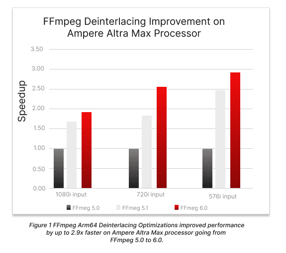 Ampere engineers studied different deinterlacing filters available in FFmpeg and investigated recent Arm64 optimizations available in recent FFmpeg releases. An FFmpeg avfilter patch that provides optimized assembly implementation using Arm64 NEON SIMD instructions showed a significant performance increase in video deinterlacing with up to 2.9x speedup using FFmpeg 6.0 compared to FFmpeg 5.0. With all architectures, and especially true for the Arm64 architecture, using the “latest and greatest” versions of software is recommended to take advantage of performance improvements.