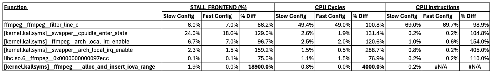 Next, we used the perf record/perf report utilities to measure various Performance Measurement Unit (PMU) counters to characterize the low-level details of how the application was running on the CPU, looking to pinpoint performance bottleneck(s). As we initially didn’t know what was limiting performance, we collected PMU counter data to measure CPU utilization (CPU cycles, CPU instructions, Instructions per Clock, frontend, and backend stalls), cache and memory access, memory bandwidth, and TLB access. As the system after reboot reached ~96% of the performance target and degraded to ~60% after running many jobs, we collected perf data after reboot and when the performance was poor. Analyzing the PMU data to look for the biggest differences in the good and poor performance cases, the kernel function alloc_and_insert_iova_range stood out by taking 40x more CPU cycles in the poor performance case. Searching Linux kernel source code via the very powerful live grep website showed this function is related to IOMMU. Rebooting the kernel with the iommu.passthrough=1 option resolved the performance degradation over time issue by reducing TLB miss rate. We were at ~96% of the performance target, so we were close but needed extra performance to meet our goals!