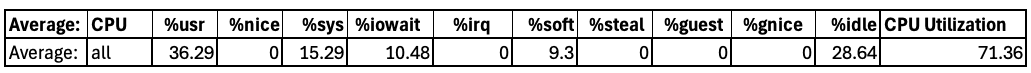 The initial results didn’t meet the target of simultaneously transcoding 100x 576i, 100x 720i, 10x 1080i, 40x 1080p30, 40x 720p30, and 10x 576p input videos. Investigating the performance showed performance initially was close to the goal yet unexpectedly slowed down over time. Following the performance methodology outlined in Ampere’s tutorial, “Performance Analysis Methodology for Optimizing Altra Family CPUs,” by first characterizing platform-level performance metrics. Figure 2 shows the mpstat utility data: initially, the system was running within ~4% of the performance target yet was only running at ~71% overall CPU utilization, with ~36% in user space (mpstat %usr), and ~35% in system-related tasks – kernel time (mpstat %sys), waiting for IO (mpstat’s %iowait), and soft interrupts (mpstat %soft). The fact that the system was idle ~29% of the time indicated that something was blocking performance.